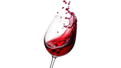 Vibrant deep red wine dramatically splashing upward in a clear glass against a stark black background capturing motion and rich color saturation for beverage advertising concepts