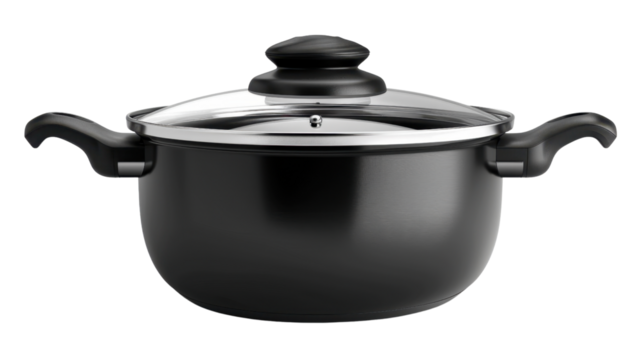 Stainless Steel Cooking Pot with Lid on Black saucepan isolated on a transparent background