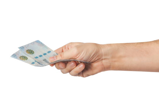 Hand-holding Saudi banknotes isolated on a white background.