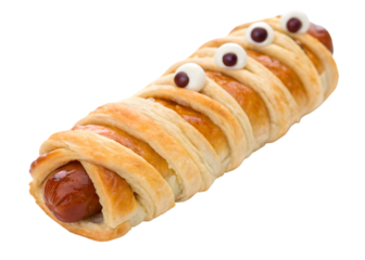 A halloween themed sausage roll with pastry strips and candy eyes on a transparent background isolated