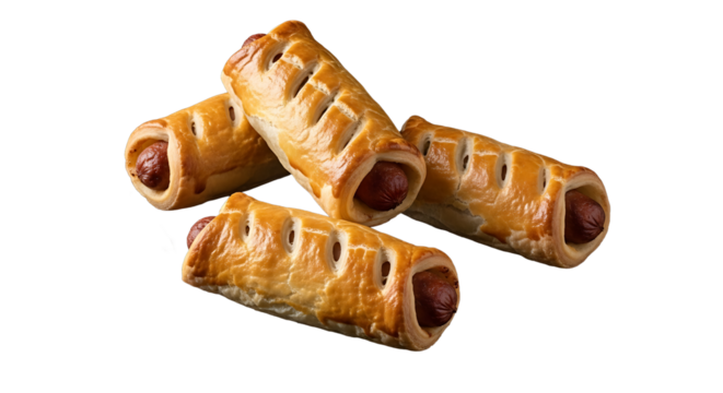 Delicious golden mini sausage rolls isolated on transparent background, savory snack