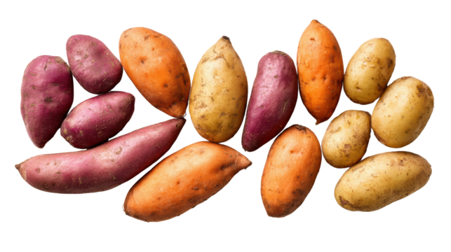 Variety of sweet potatoes on white isolate background, showcasing different shapes and colors for culinary inspiration.