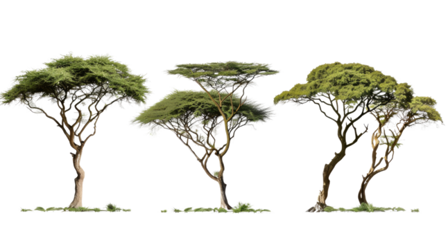 Acacia tree isolated on white transparent sky, Vachellia tortilis in African savannah