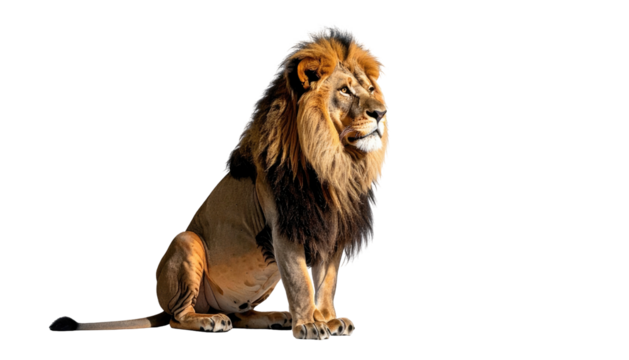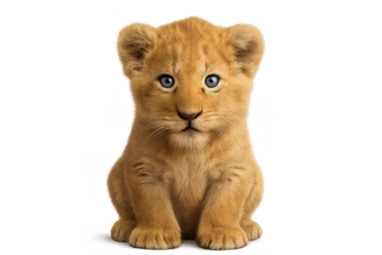 Lion cub sitting, looking forward with blue eyes, young jungle animal on transparent background