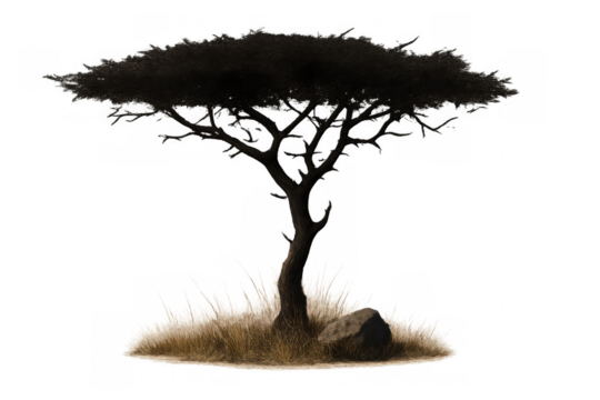 African savanna tree silhouette with dry grass and rock, isolated creating a natural landscape element
