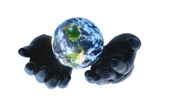 AI protecting the planet, Carbon cyborg hand gently holding realistic Earth, Sustainable future concept created by 3D modeling.