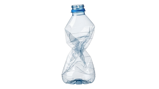 Empty crushed clear plastic water bottle standing upright, cut out, stock png, isolated on transparent background