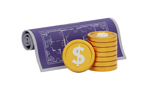 Rolled Blueprint Document with Stack of Golden Coins Featuring Dollar Sign on Transparent Background