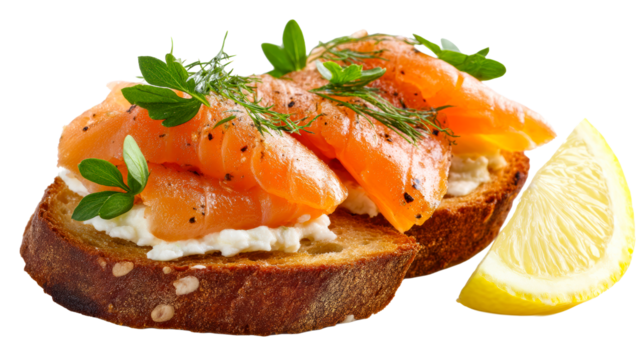 Savory Smoked Salmon and Cream Cheese Open-Face Sandwiches with Dill and Lemon Slice, cut out transparent