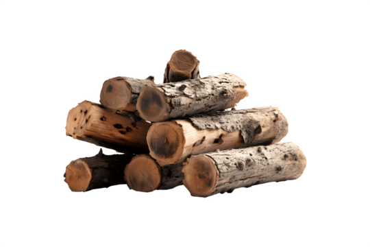 Isolated pile of brown logs of wood, firewood, log stack, timber for winter heating fire