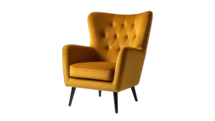 Elegant mustard yellow armchair isolated PNG, stylish tufted wingback chair with black legs for living room or lounge area decor
