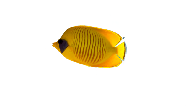 A vibrant yellow butterflyfish with striking black markings swims gracefully in clear water, showcasing its intricate patterns