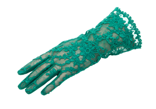 Elegant teal lace glove with intricate floral and scalloped design suitable for fashion or costume