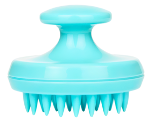 Light blue plastic scalp massager with silicone bristles for hair on a transparent background