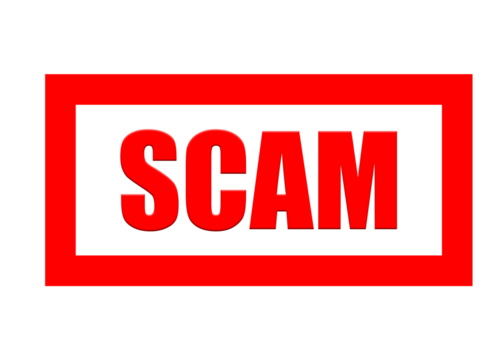 Red scam alert sign with yellow warning triangle and exclamation mark isolated on transparent background