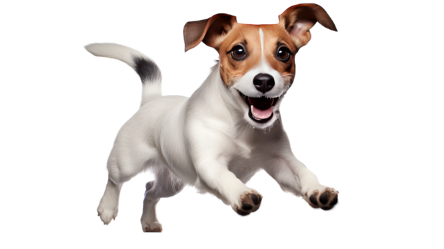 A small brown and white dog energetically scurries across a pristine white floor