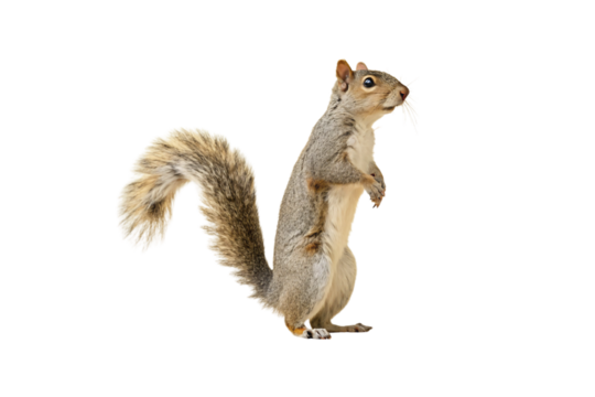 Gray squirrel stands upright on hind legs with bushy tail curled, looking alertly to side, isolated on a transparent background