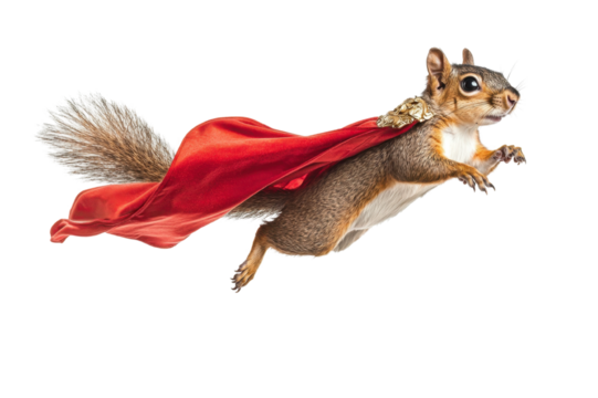 Cute squirrel wearing a red cape, flying like a superhero, isolated on a white background. Fun and whimsical animal concept.