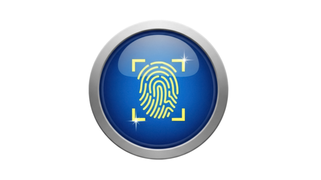 A green button with a black center displaying a white fingerprint on a black background in a circle on transparent background