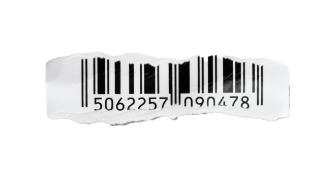 Barcode label torn paper identification product code scan retail blue white black lines price tag on transparent background