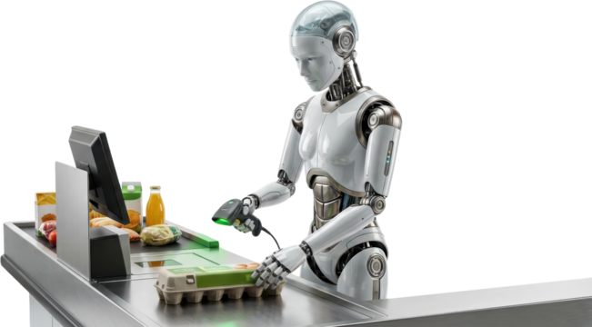 A white humanoid robot scans eggs at a supermarket checkout counter with groceries visible artificial intelligence AI grocery scanning cashier automation futuristic