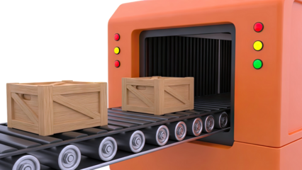Wooden Crates on Industrial Conveyor Belt with Scanner