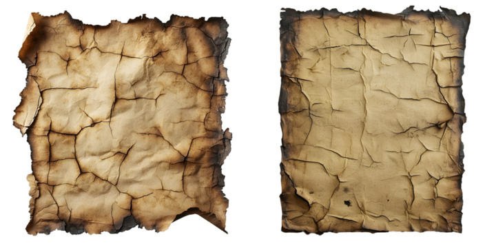 Aged burnt paper with scorched edges showing signs of wear and tear. isolated on a transparent background