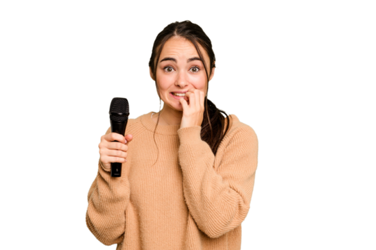 Young caucasian singer woman isolated on green chroma background biting fingernails, nervous and very anxious.