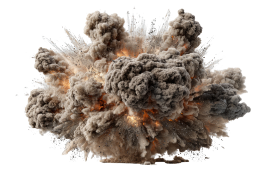 A billowing explosion erupts, forming a mushroom cloud of smoke and debris, fiery core visible