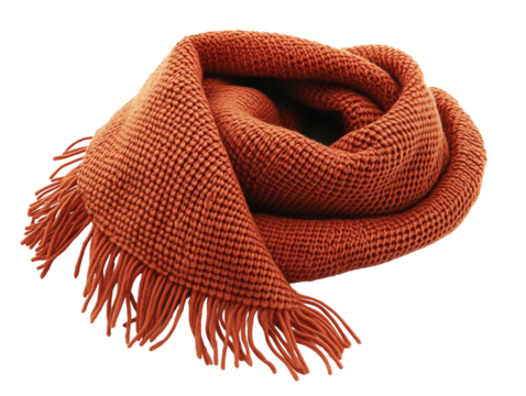 Isolated knit scarf in maroon with fringe, a classic winter accessory for warmth and fashion