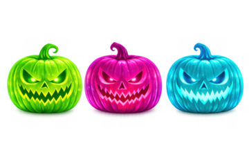 Three neon glowing jack-o'-lanterns with spooky faces, creating a vibrant halloween atmosphere with scary colors and light