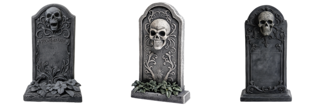 set of a spooky tombstone decoration with eerie engravings and a skull on a transparent background