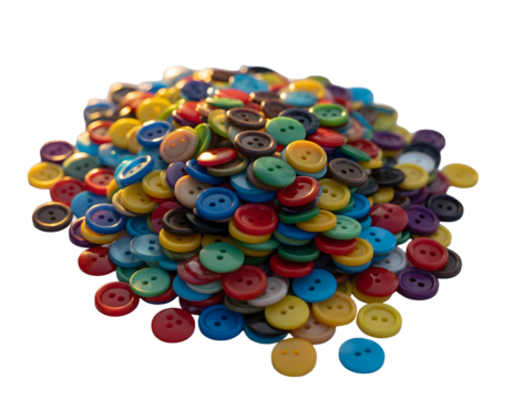 A collection of multicolored buttons with various sizes and shapes are scattered together in a pile on a white surface