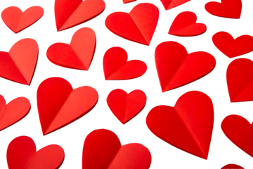 Numerous Red Paper Hearts Scattered on White Background