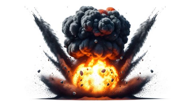 Massive destructive explosion featuring intense bright orange fireball erupting upwards sending dark smoke plumes and debris violently scattering across the frame in a powerful cosmic event depiction