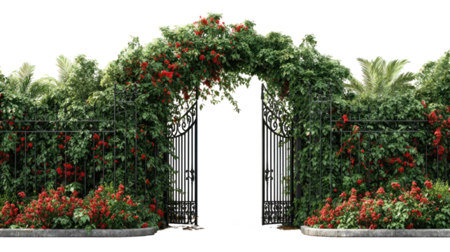 Archway Covered in Lush Green Foliage with Red Flowers on Transparent Background