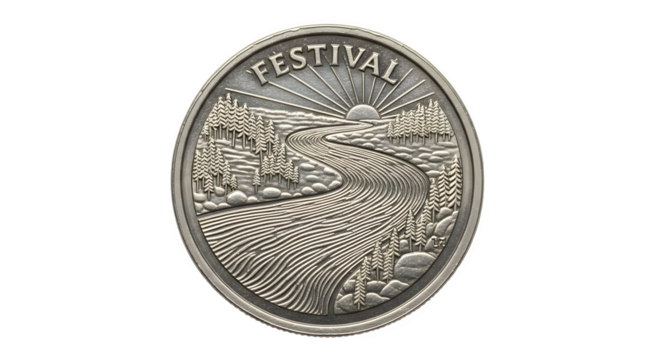 Festival coin isolated on transparent background, a commemorative token featuring a scenic river landscape, symbolizing community celebration and artistic design