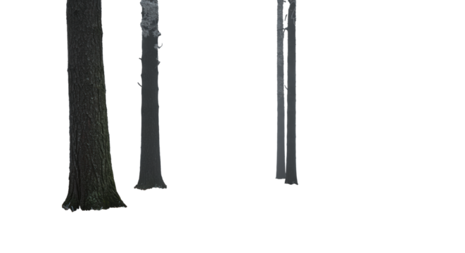 Desaturated panoramic cinematic view of a foggy, desolate pine forest; sharp hoarfrost texture foreground, tall trees fading into volumetric mist, transparent copy space. Concept of cold wilderness