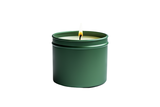 Green candle tin metal with lid flatlay on transparent background for elegant home decor, spa, aromatherapy, and relaxation projects
