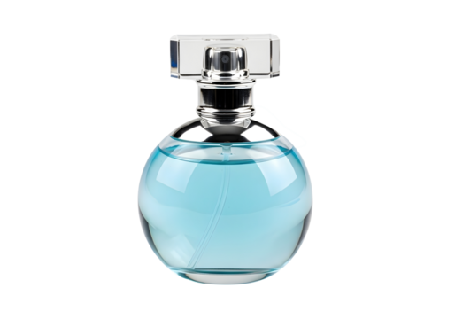 Elegant glass perfume bottle with blue liquid isolated on transparent background