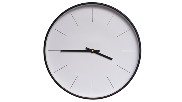 Minimalist White face and Black frame Wall Clock on White background - Perfect for Time Management and Scheduling Concepts - 15.45, 3.45
