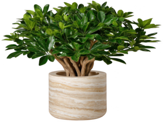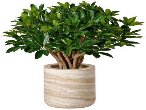 Schefflera arboricola plant in beige marble pot isolated on transparent background