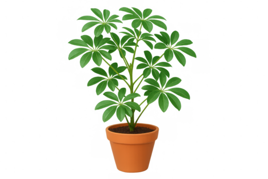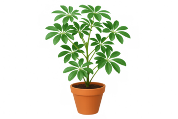 3d rendering showing lush schefflera arboricola with vibrant green foliage, growing in classic terracotta planter against transparent backdrop