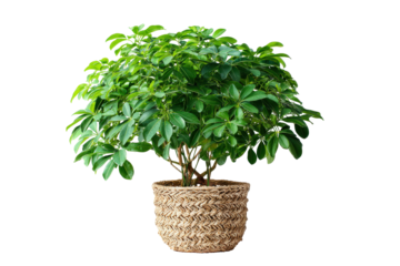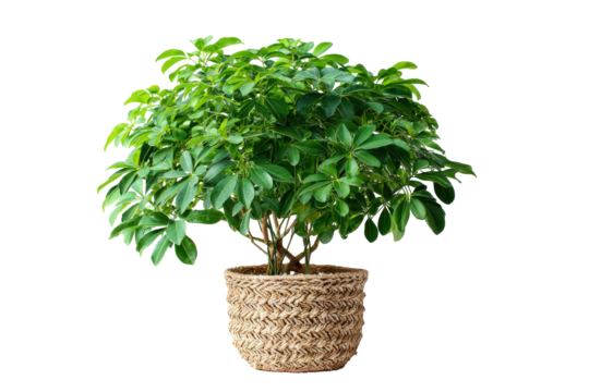 Lush green Schefflera arboricola plant in a woven basket pot.