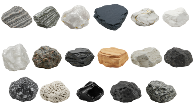 Assorted geological specimens displayed on a plain white surface area transparent background
