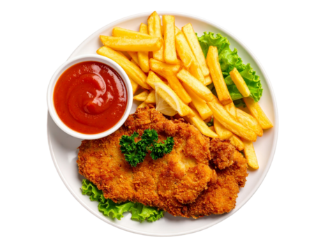 Top and side view of crispy breaded schnitzel served with French fries and fresh mixed salad on white plates, isolated on transparent background, ideal for comfort food, lunch, and dinner visuals