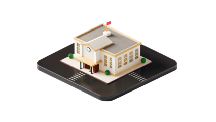 Classic one-room schoolhouse with bell tower, clapboard siding, and symmetrical windows, isolated on white background