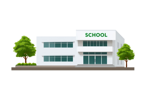 Modern white school building with green trees and large windows on transparent background, PNG
