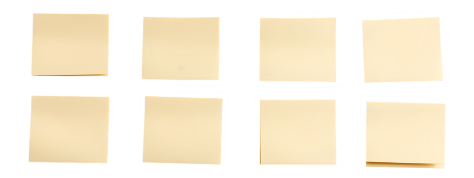 Grid of Sticky Notes: A collection of eight blank sticky notes arranged in a neat grid, providing a clean and organized canvas for ideas, reminders, and creative expression.