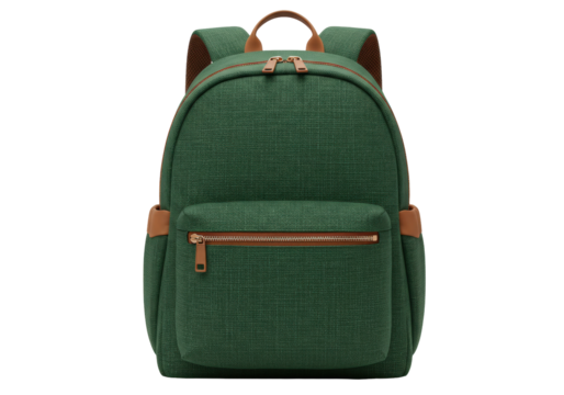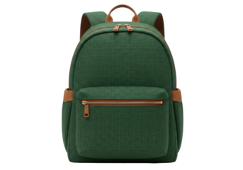 Isolated green school backpack with brown straps, zippered pocket, handle for holding